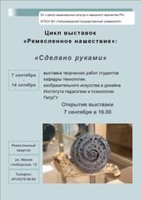 Первую выставку – «Сделано руками» - открыли 7 сентября на Малой Слободской, 12. Студенты и преподаватели кафедры технологии, изобразительного искусства и дизайна Петрозаводского Государственного университета представили результат своего творческого поиска за 2017-2018 годы: керамические вазы и подсвечники, коллекцию костюмов, эксклюзивную авторскую бижутерию, аксессуары из текстиля, дерева и бумаги, графические работы.