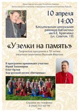 Хор русской песни «Питарицы» представит жителям Кондопоги творческую программу, посвященную 70-летию писателя-сказочника Василия Фирсова «Узелки на память». Место проведения Кондопожская центральная районная библиотека им. Е.Б. Кравченко (ул. Советов, 19), начало 14.00.