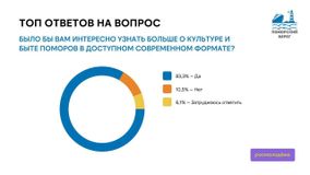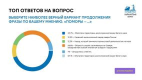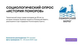 Команда проекта «Поморский берег» провела тематический социологический опрос среди молодежи, чтобы выяснить, какой уровень знаний у них есть о поморах и насколько важно для них изучение истории своего региона. Опрос был проведен среди более 200 молодых людей, большинство из которых были не старше 20 лет. Результаты показали, что молодежь Карелии заинтересована в изучении истории своего края и культуры поморов. Большинство знает, что поморы — это народ, проживающий у Белого моря на севере, который занимается рыбным промыслом. Однако многие респонденты затруднились ответить о каких музеях поморской культуры они слышали.