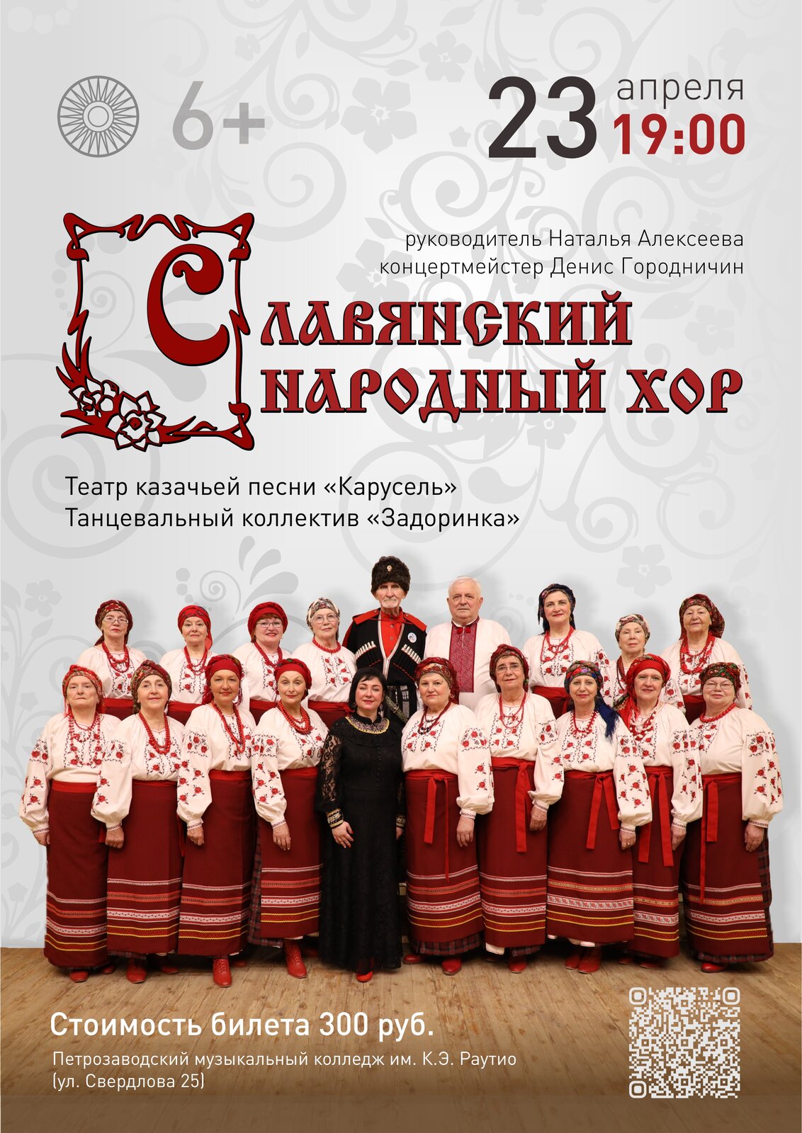 Славянский народный хор поёт уже более 30 лет. Каждое выступление коллектива – это не просто концерт, а настоящий праздник, в котором звучат знакомые мелодии и хочется подпевать. Живая, искренняя и мощная энергия голосов хористов заряжает зал и не отпускает ещё долго после финального аккорда.
