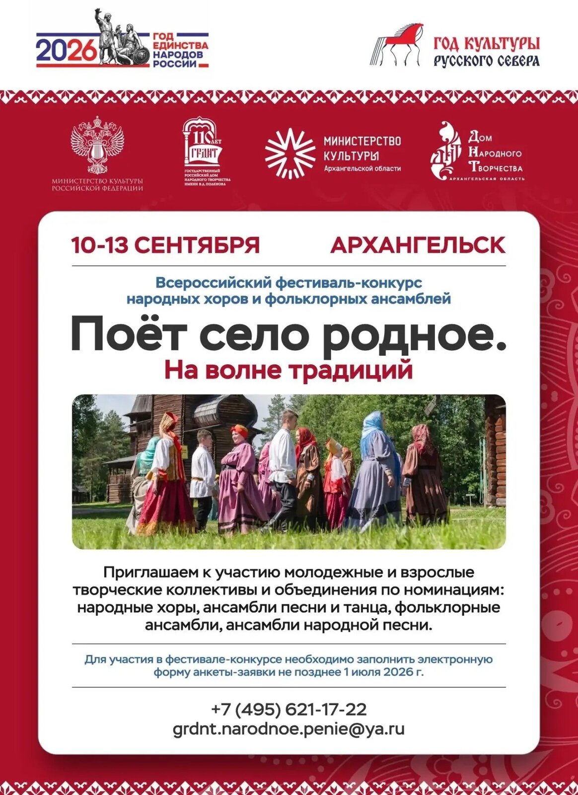 В 2026 году один из самых авторитетных и крупных смотров народно-певческого искусства пройдёт с 10 по 13 сентября 2026 года в Архангельске в рамках Года единства народов России.
